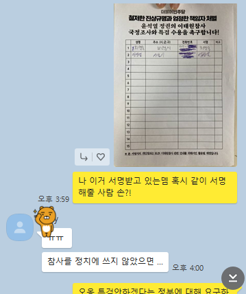 이태원 참사에 대해 국정조사를 요구하는 서명에 같이 참여하지 않겠냐고 단체톡방에 올렸다가 이런 답을 들었습니다.
