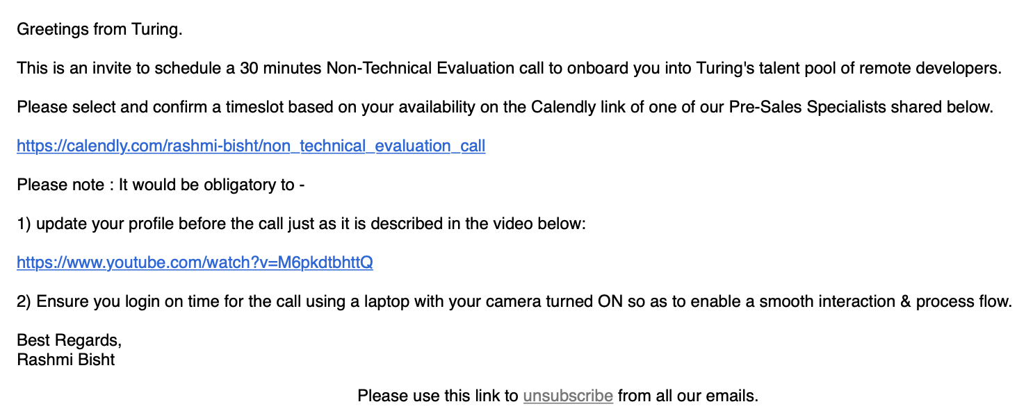 튜링에서 메일이 한통 도착했습니다. 내용은 Non-Technical Evaluation call 을 하기위해 스케쥴을 알려달라는 것이었어요.