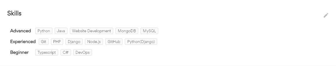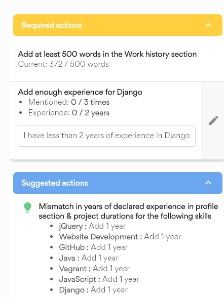 오른쪽의 편집 아이콘을 누르면 각 스킬을 추가/삭제 할 수 있고 경력기간과 능력수준을 수정할 수 있다. 업로드한 이력서가 아닌 프로필 에서 작성한 Work history , side project 등에서 입력한 키워드를 기반으로 자동 생성된다. 잠깐 언급한 것도 모두 추가되니 경력 1년 미만의 키워드(스킬)은 삭제하는 것이 좋다.