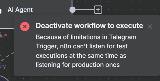 Because of limitations in Telegram Trigger, n8n can't listen for test executions at the same time as listening for production ones