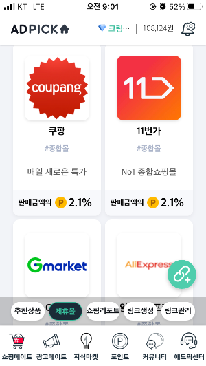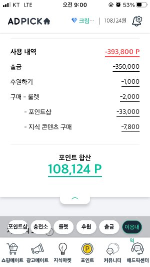 그리고 현재 출금 가능한 포인트는 108,124라고 되어있습니다.