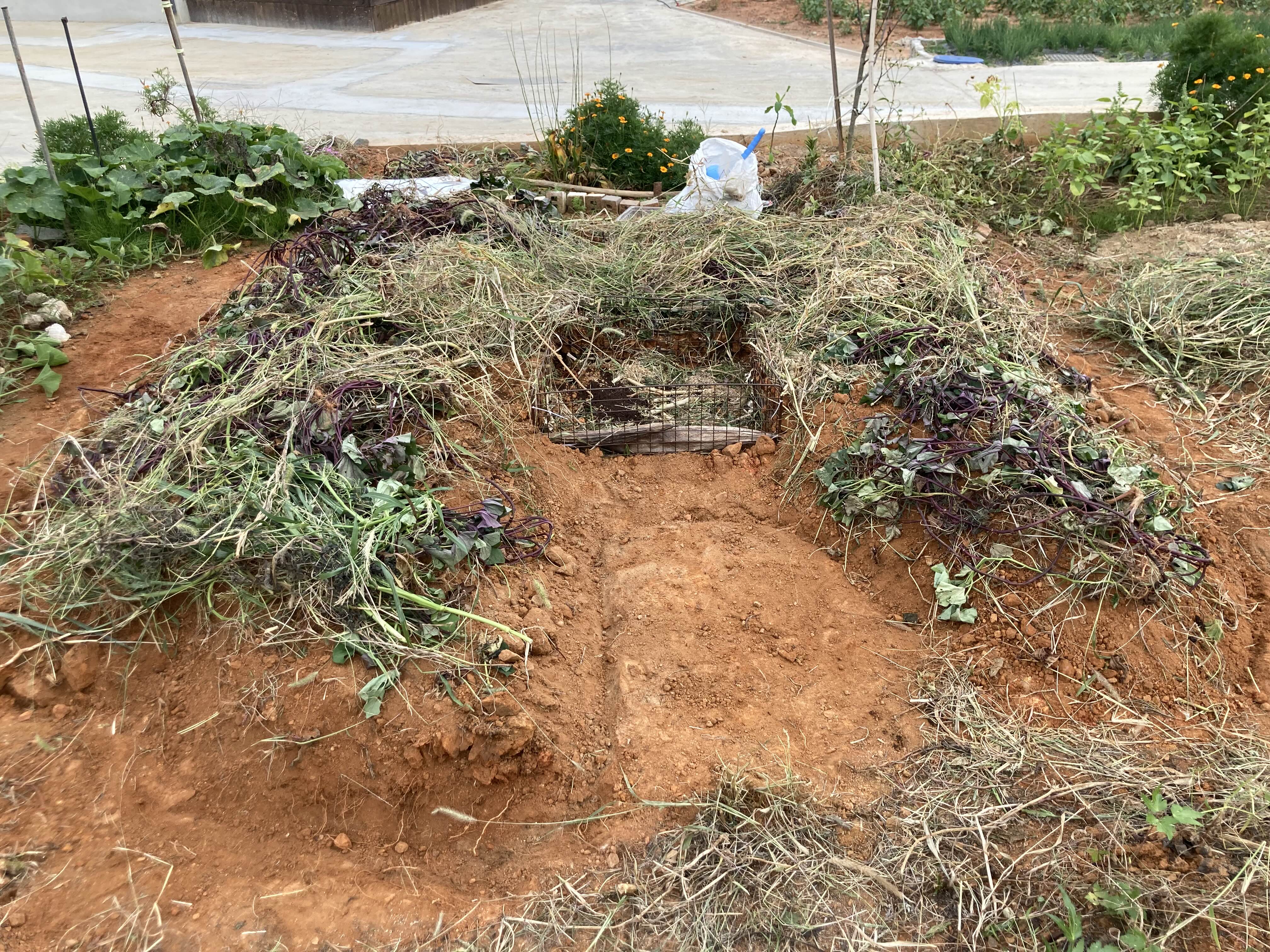 키홀가든 방식으로 해보려고 가운데 퇴비장을 넣어두었다. (생활용품점에서 산 철망 네개, 밑바닥은 없음)