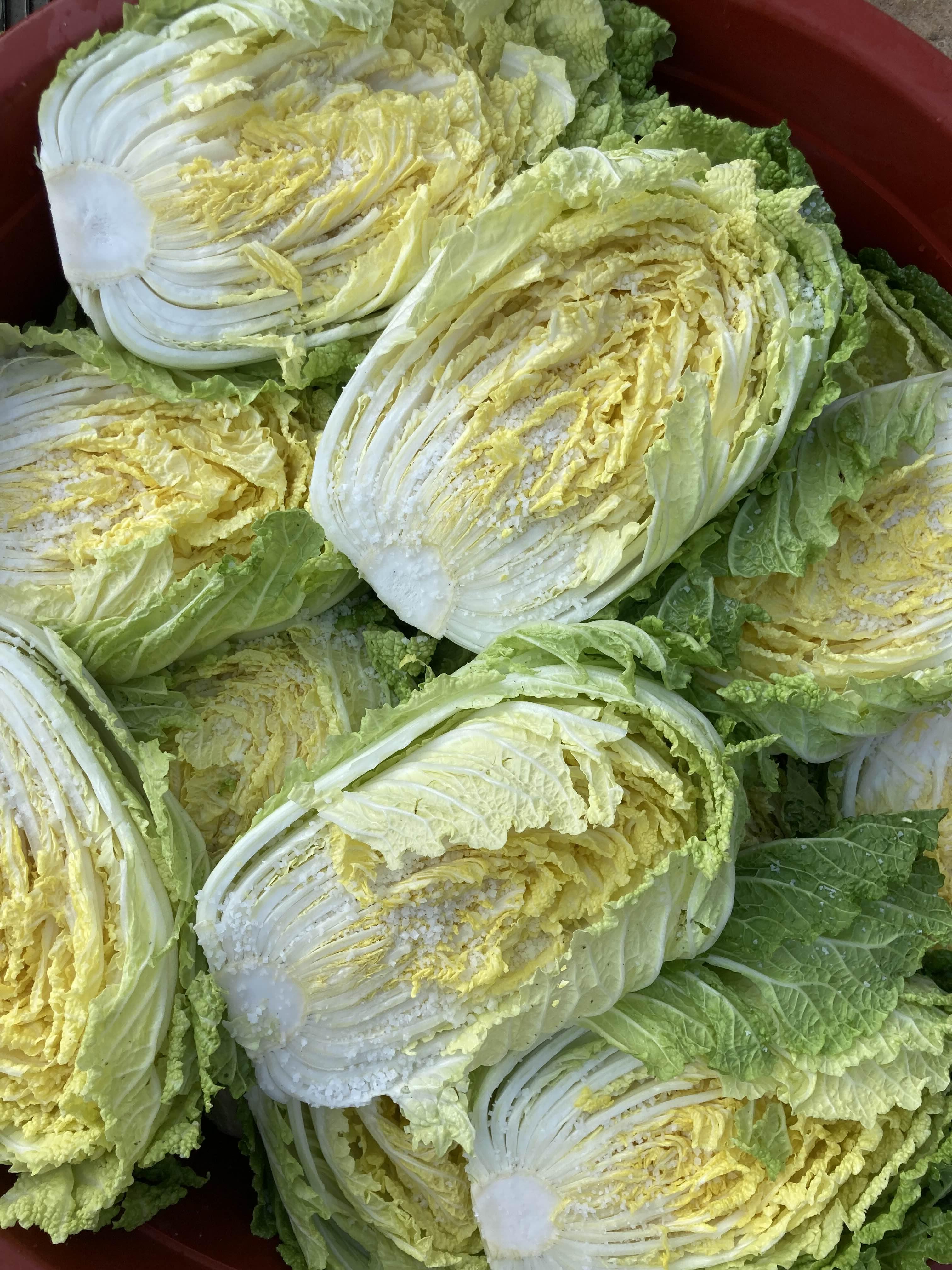 잠들기 전 배추를 윗층아랫층을 서로 바꿔준다 이때 빳빳함이 더 세면 소금을 더 뿌려준다