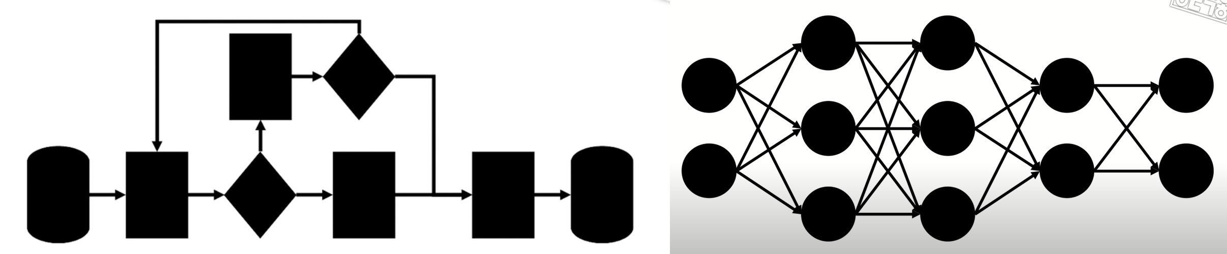 여기서 잠깐 IT용어 리마인드 하고 가겠습니다. 알고리즘을 이용해 코드로 적어놓으면 프로그램이 되고, 알고리즘을 그림으로 그려놓은 것을 플로우차트라고 합니다. 아래 그림은 사람이 알고리즘을 생각해서 그림으로 그려놓은 플로우차트와 딥러닝에서 학습하는 구조를 설명한 플로우차트입니다.