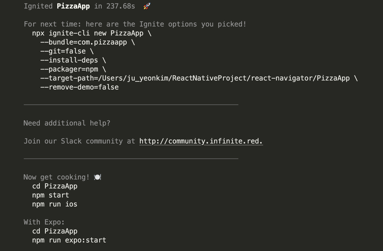 Ignite(이그나이트) 는 React Native 앱을 생성해주는 CLI(Command-line Interface) . 초기세팅을 몇 가지 가지고 앱이 생성된다.