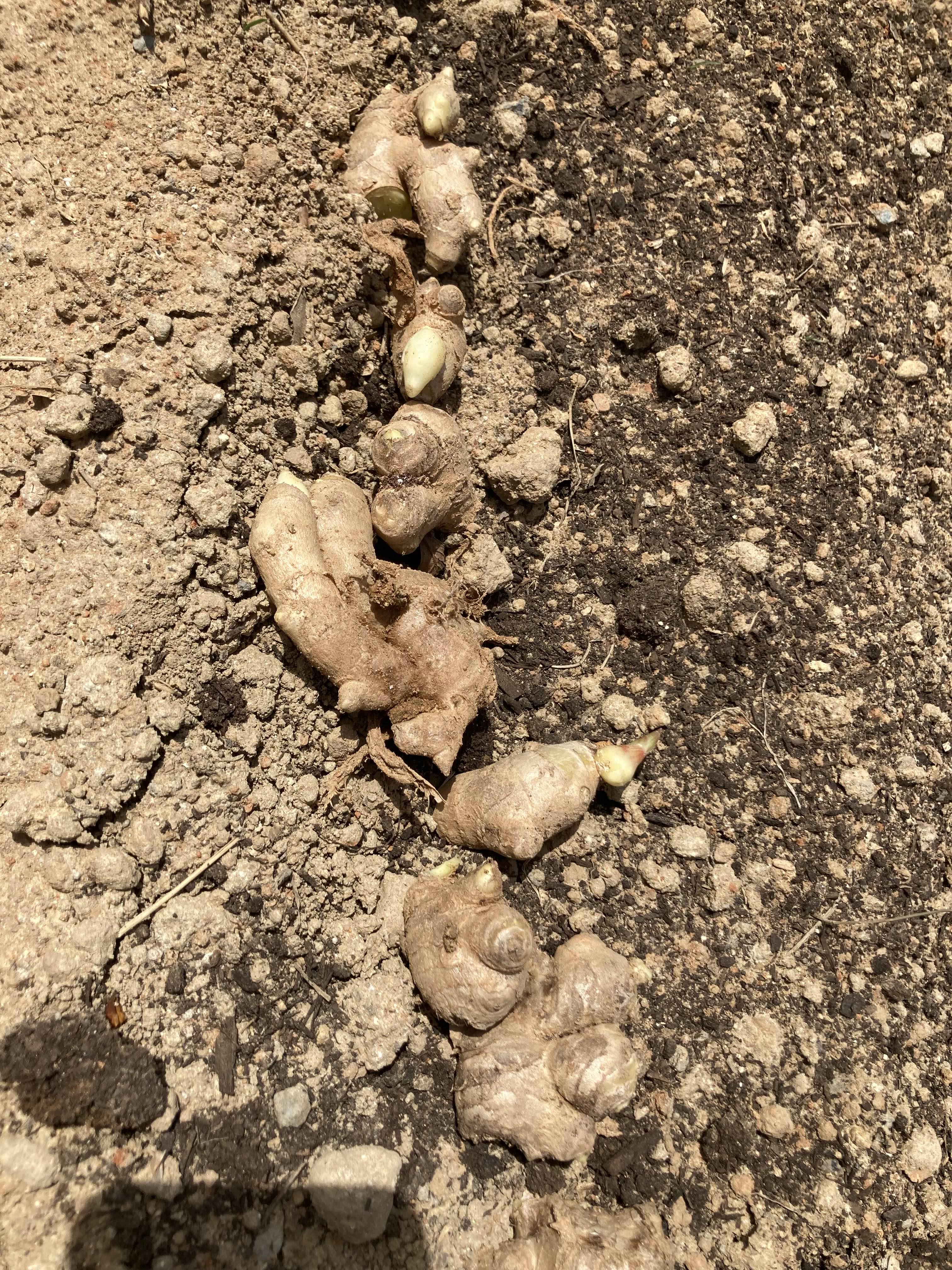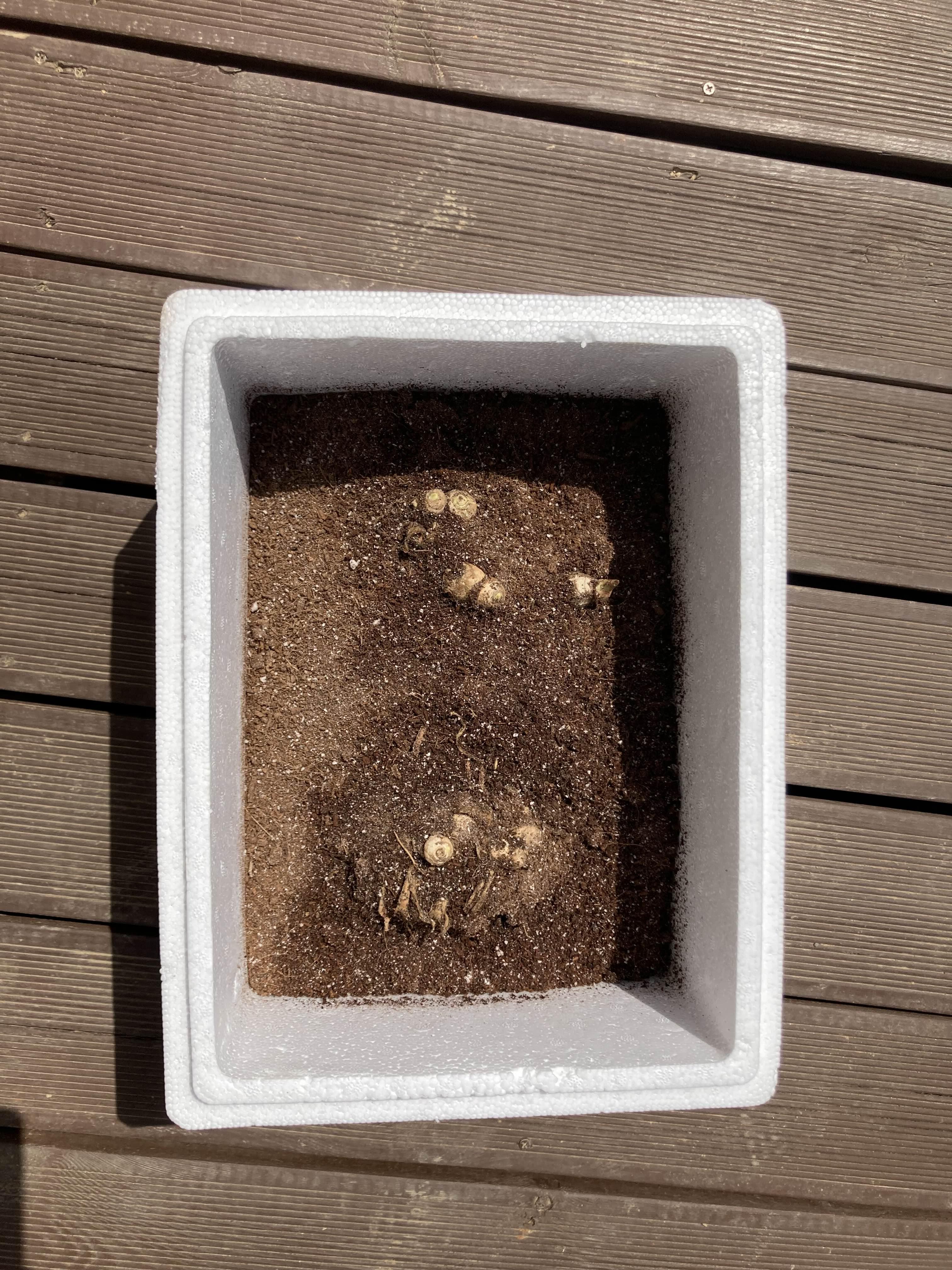 흙이 너무 뿌리 뻗기엔 수분머금기도 힘들고 딱딱해질테니 상토를 조금 뿌리고 생강을 꽂았다.