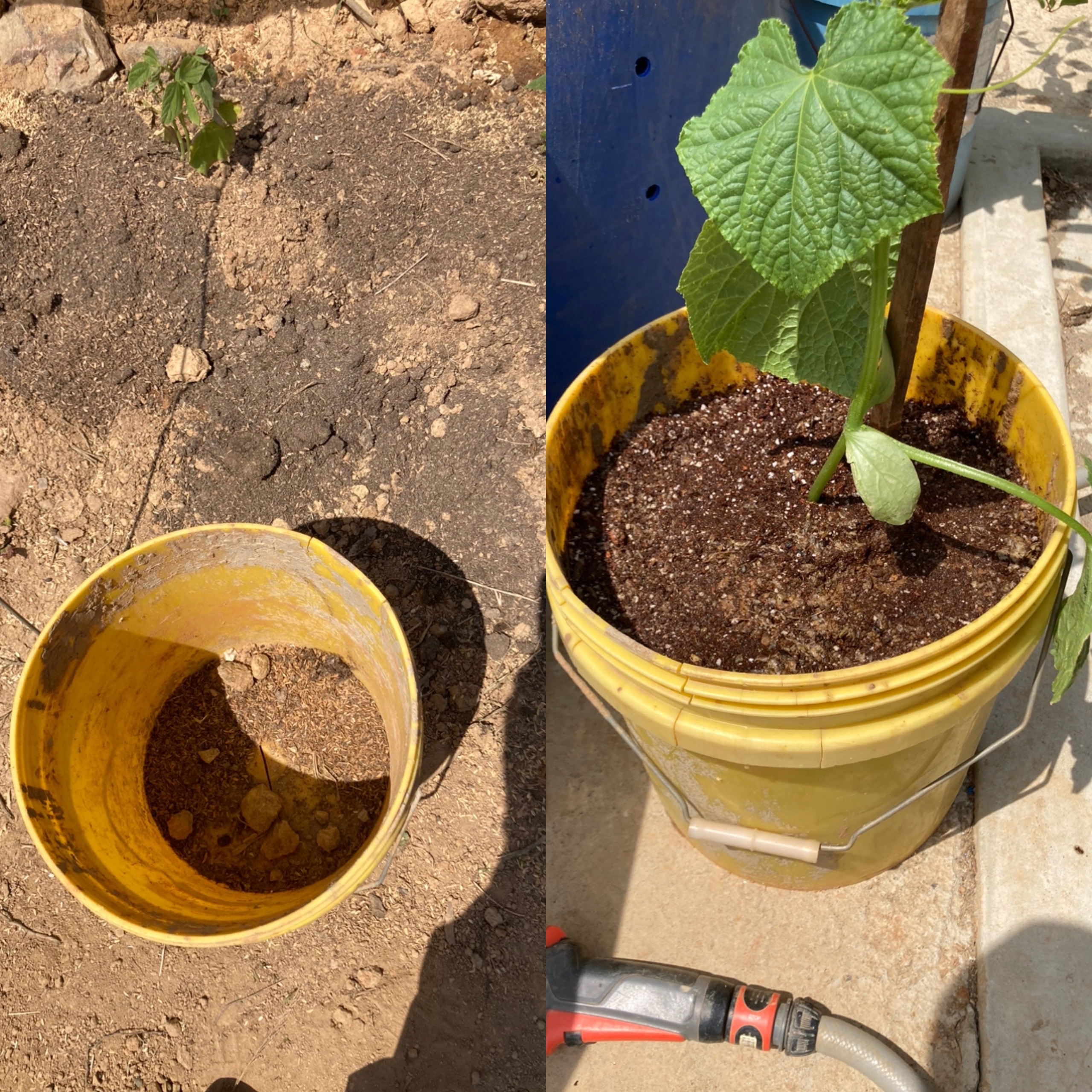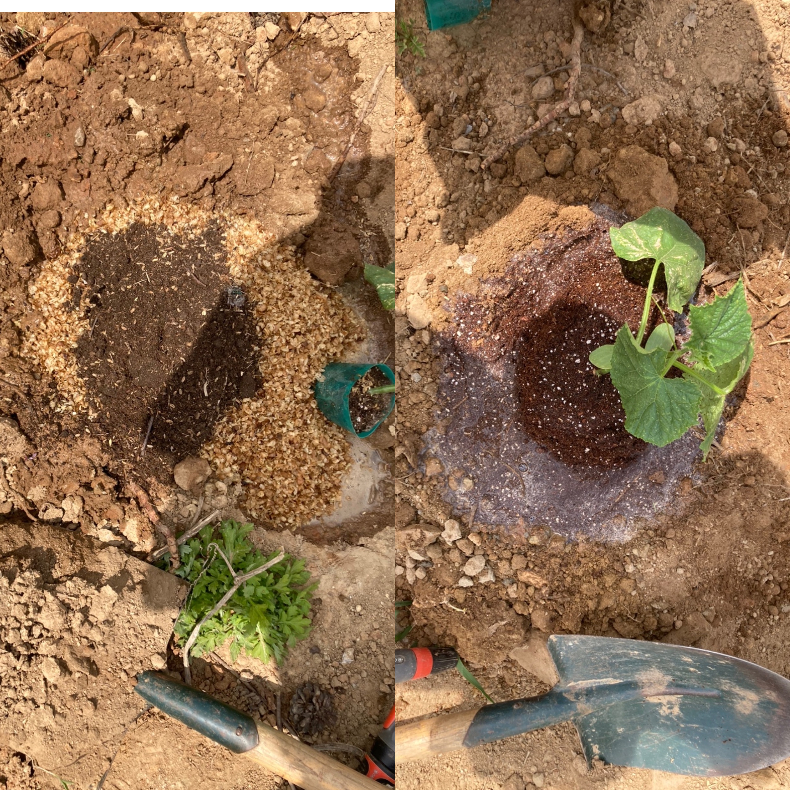 두개의 오이 모종 중에 하나는 밭에 심었다 마찬가지로 구멍을 파고 물을 채운뒤 상토 왕겨 거름을 섞어 모양을 만든 뒤 오이를 꽂았다 ㅋ