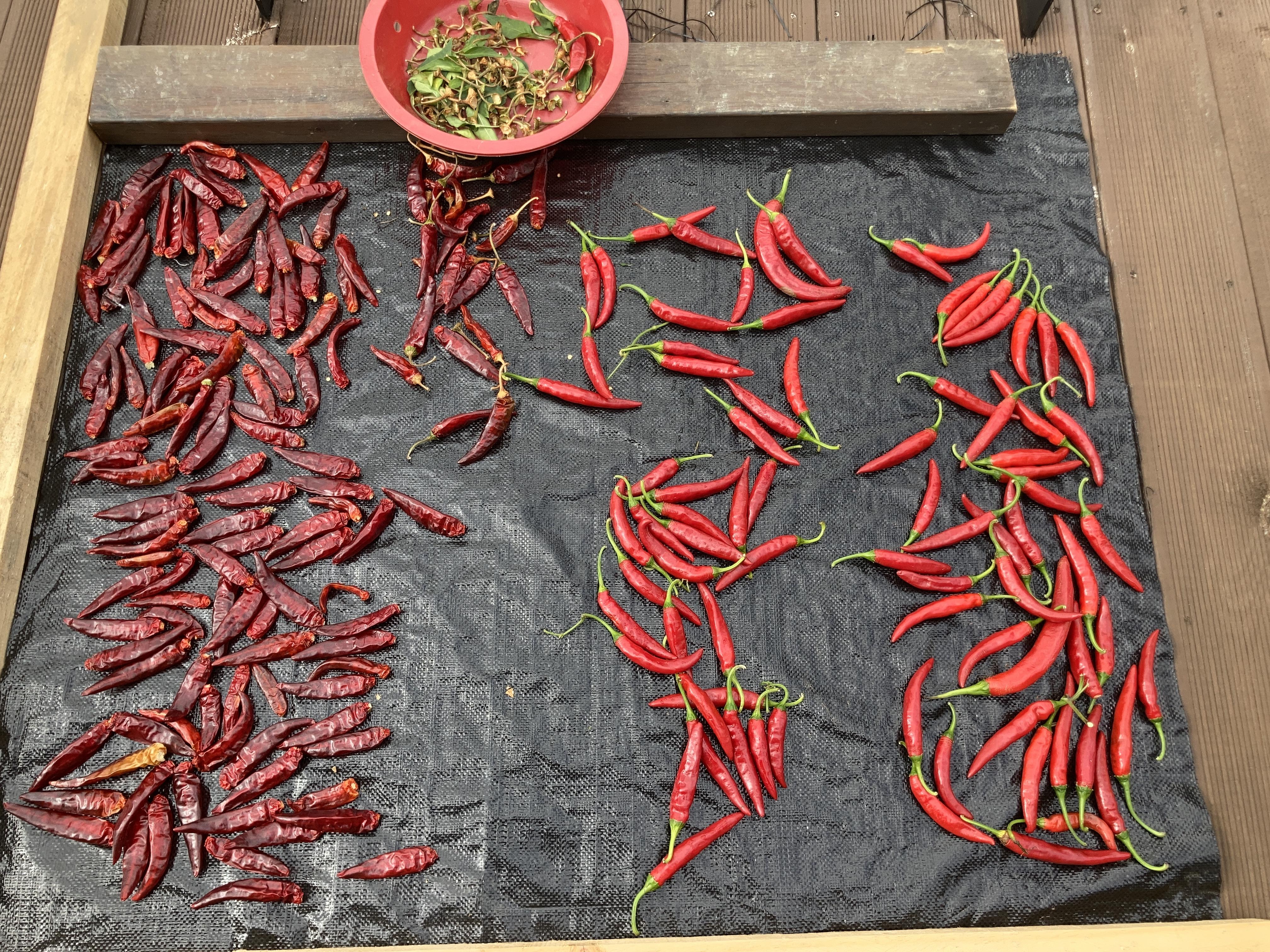건조기에서 꺼낸 고추는 꼬다리를 따고 볕에 말리되, 이미 반 가르기를 해서 말렸다면 떨어져나온 씨는 냉장고와 햇볕을 오가며 같이 말려둔다.
